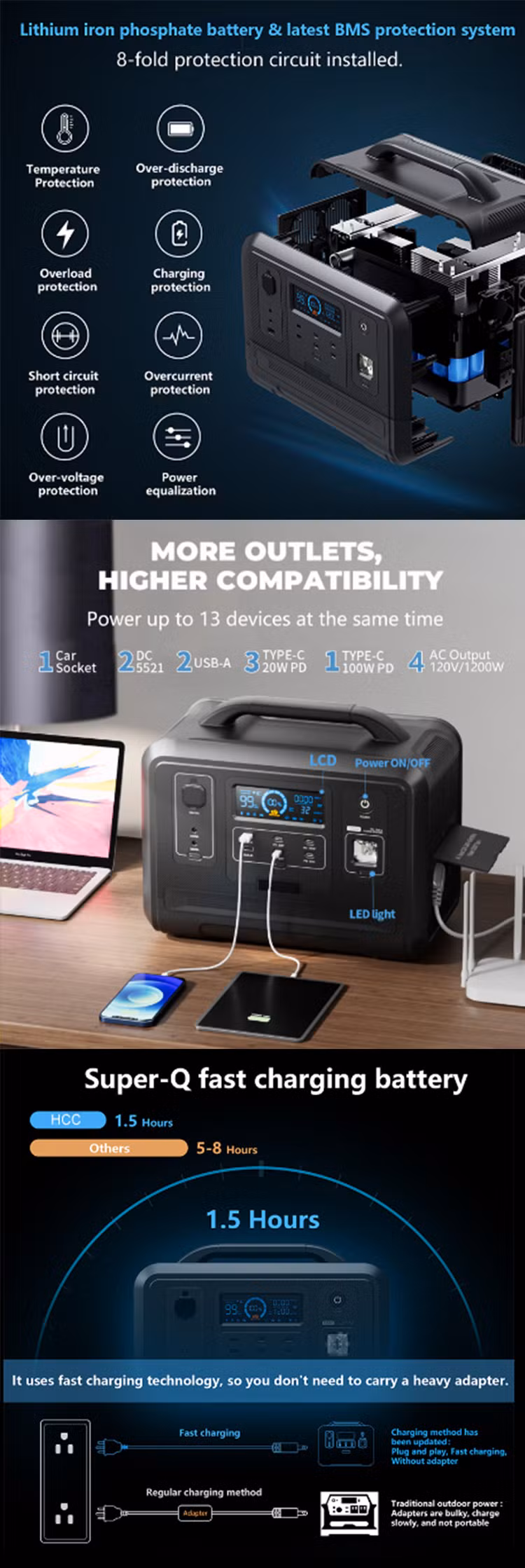 Connect the product between the wall socket and the device, when there is a sudden power failure, our power station will automatically switch to the UPS power supply mode within 10ms, so that the computer, refrigerator, warmer and other devices under 1100W can work safely.